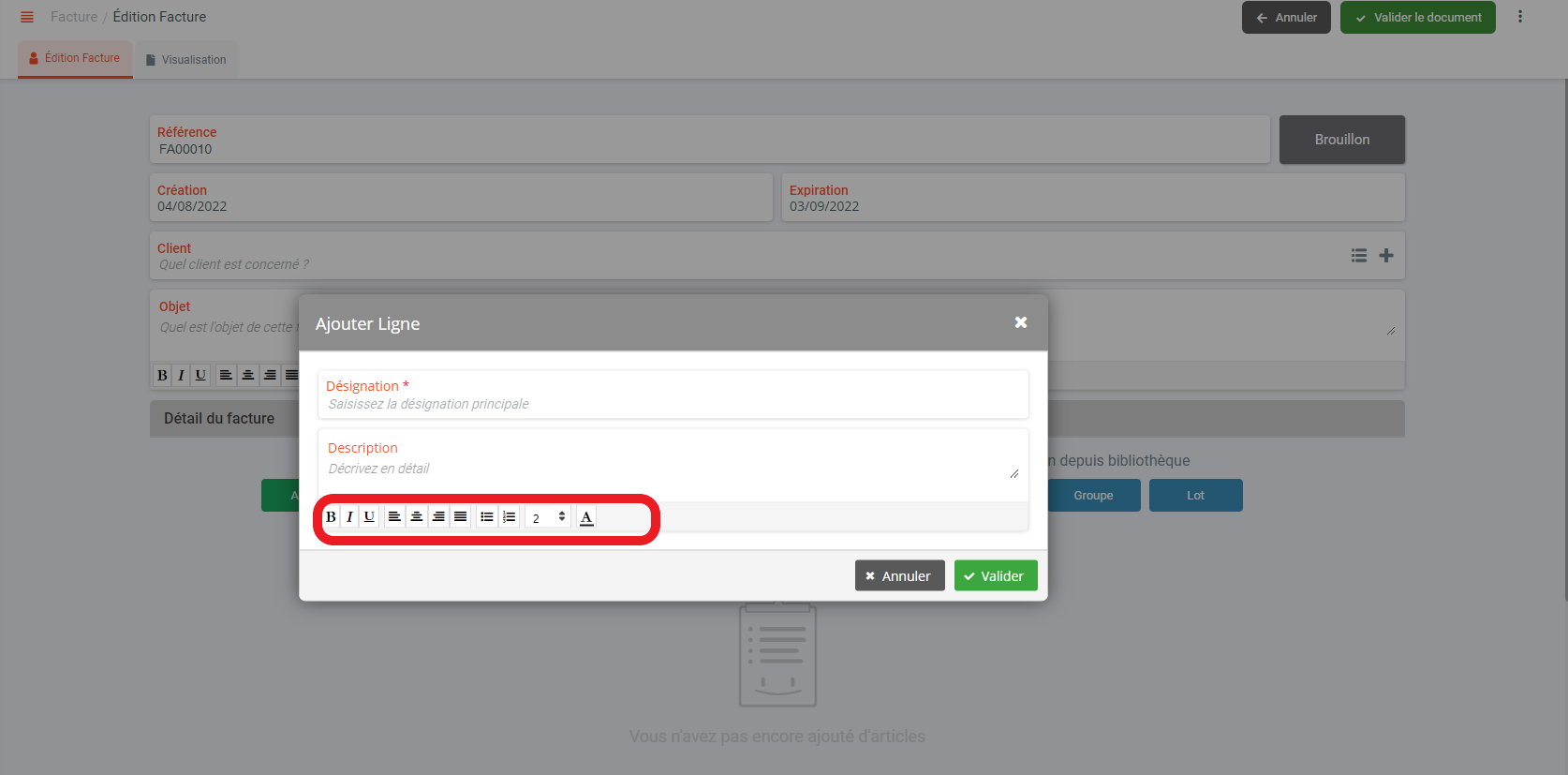 Que se soit sur "Objet", "Description d'un article" ,"Ligne", "Note"ou "Condition de règlement" vous pouvez changer les diverses options de mise en forme disponibles (polices, gras, italique...etc.),