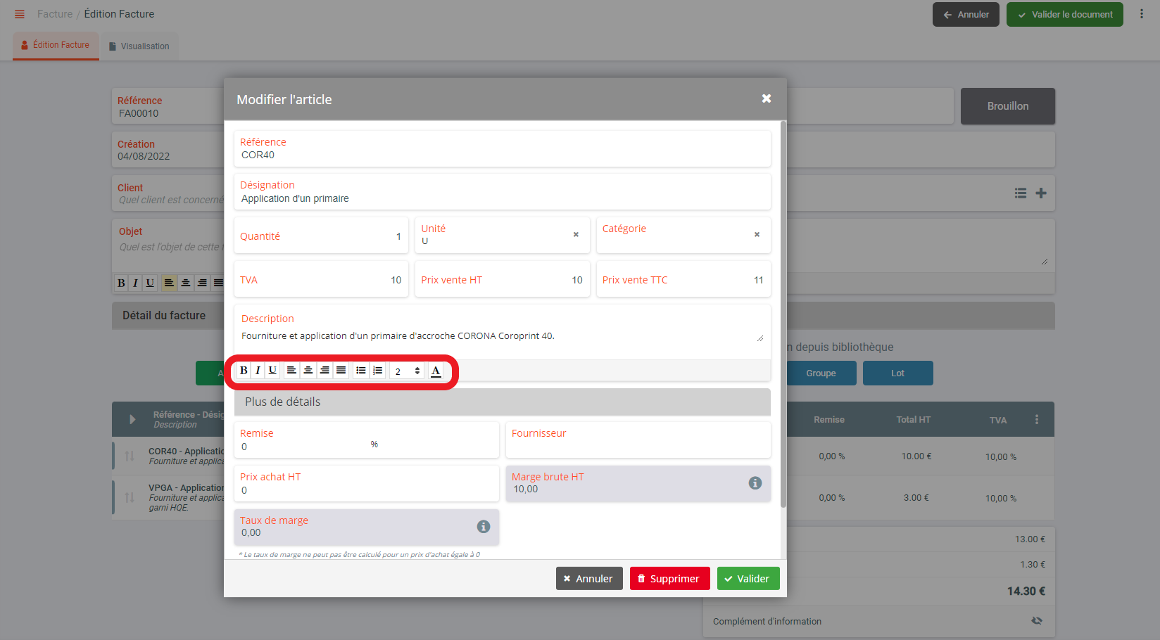 Lorsque vous rédigez la description d'un article, une ligne de facturation ou l'objet du document, Artinove a mis à votre disposition des balises de formatage pour modifier le style, le format du texte ainsi que les couleurs et mettre en avant les choses importantes sur vos documents.