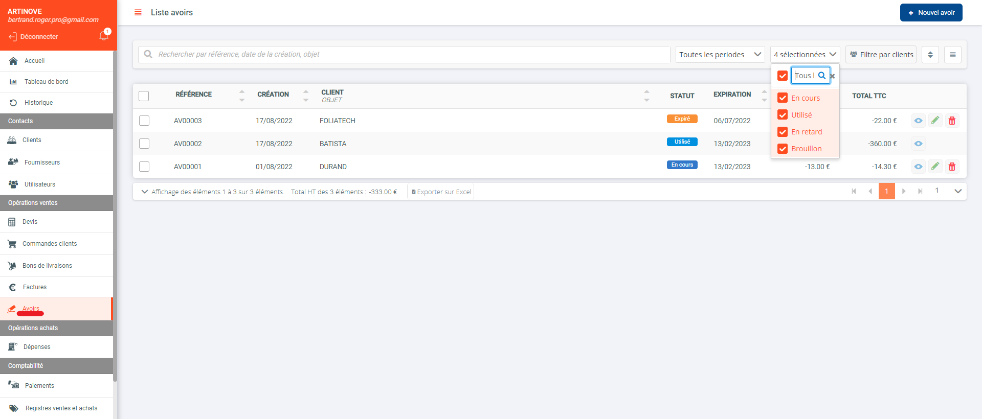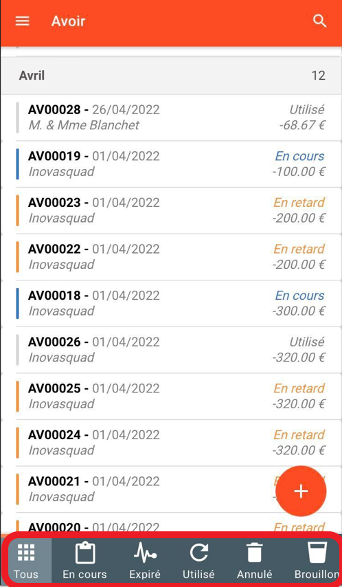 Les avoirs sont marqués par leur statut. Retrouvez ainsi facilement les avoirs qui sont en cours, utilisés ou qui ont été annulés ou expirés.