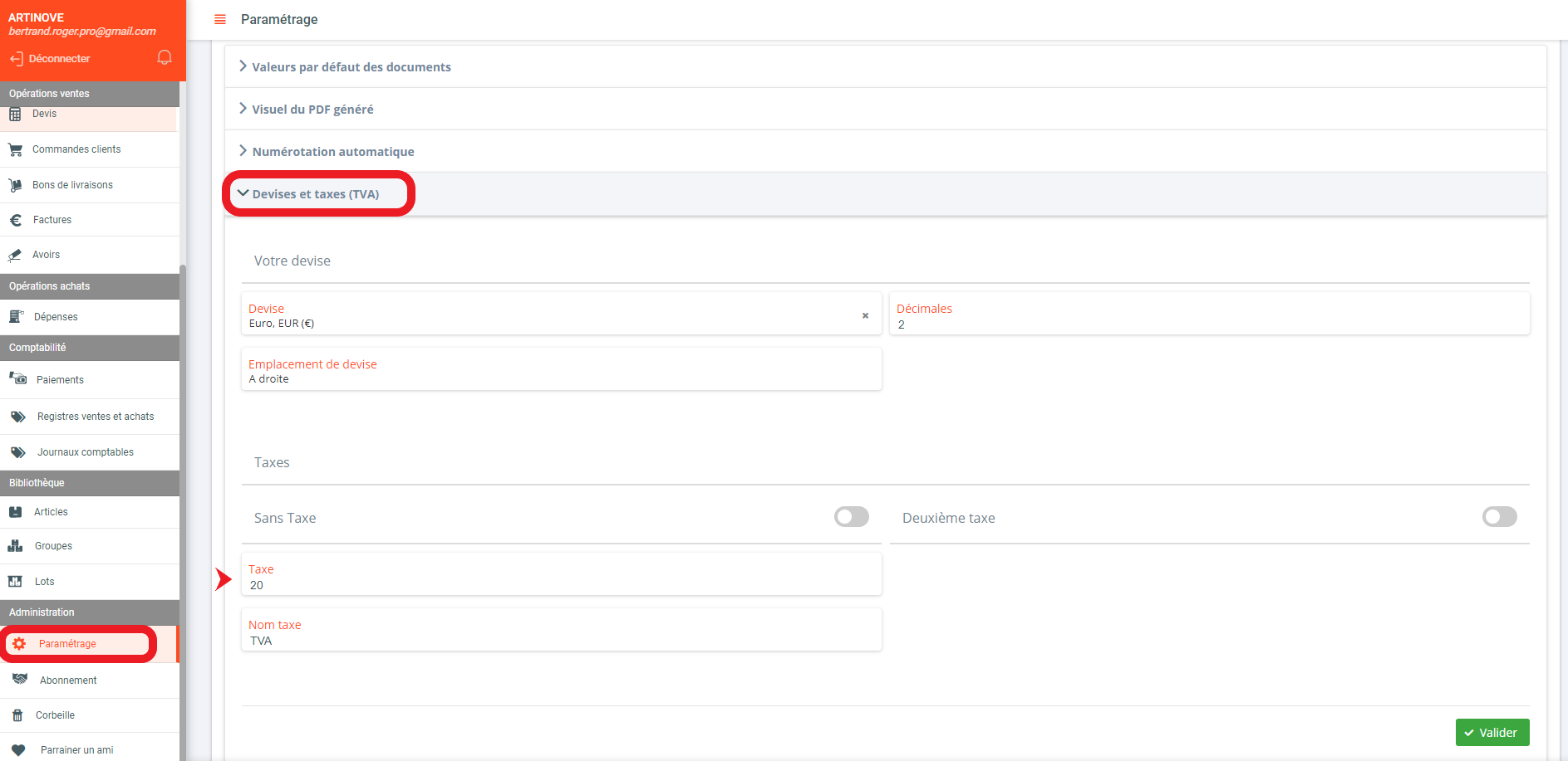 - Rendez vous dans "Paramétrages"> "Paramétrage des documents" puis "Devises et taxes (TVA)"
