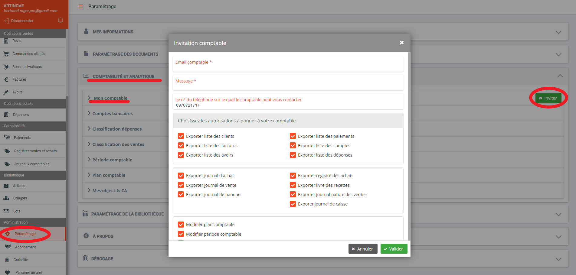 Grace au module comptable, vous avez la possibilité d’inviter votre expert comptable. Pour cela: