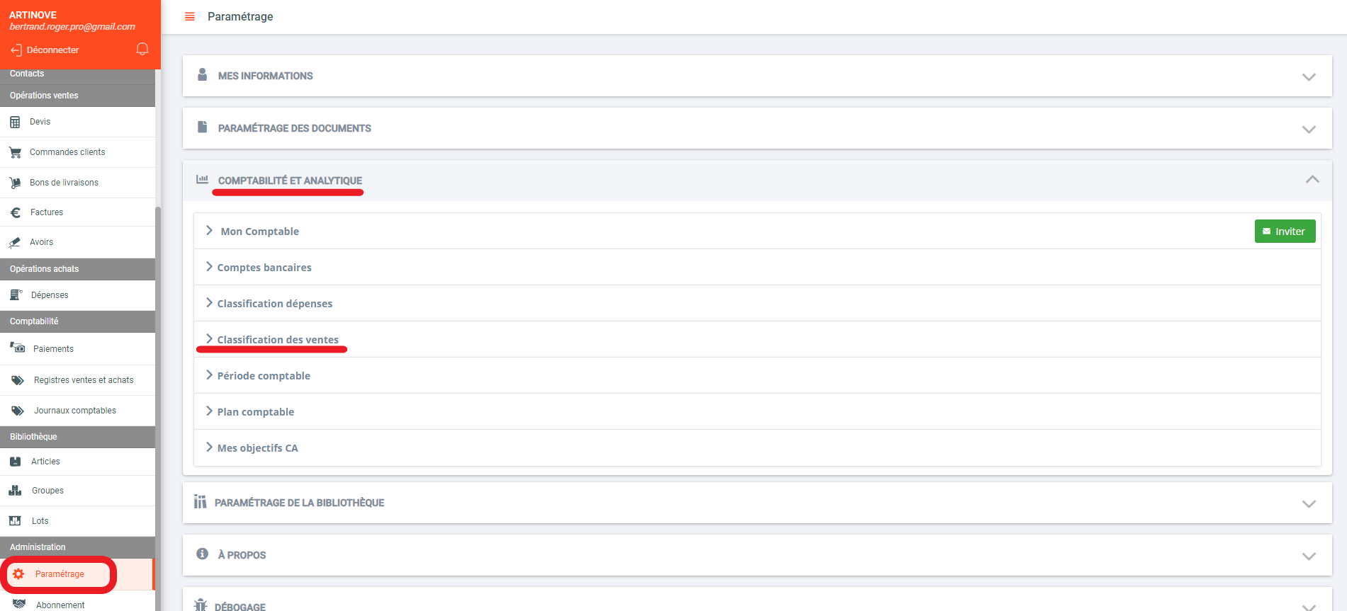 - Allez-y dans "Paramétrage" puis "Classification des ventes" dans la rubrique "Comptabilité et "Analytique".