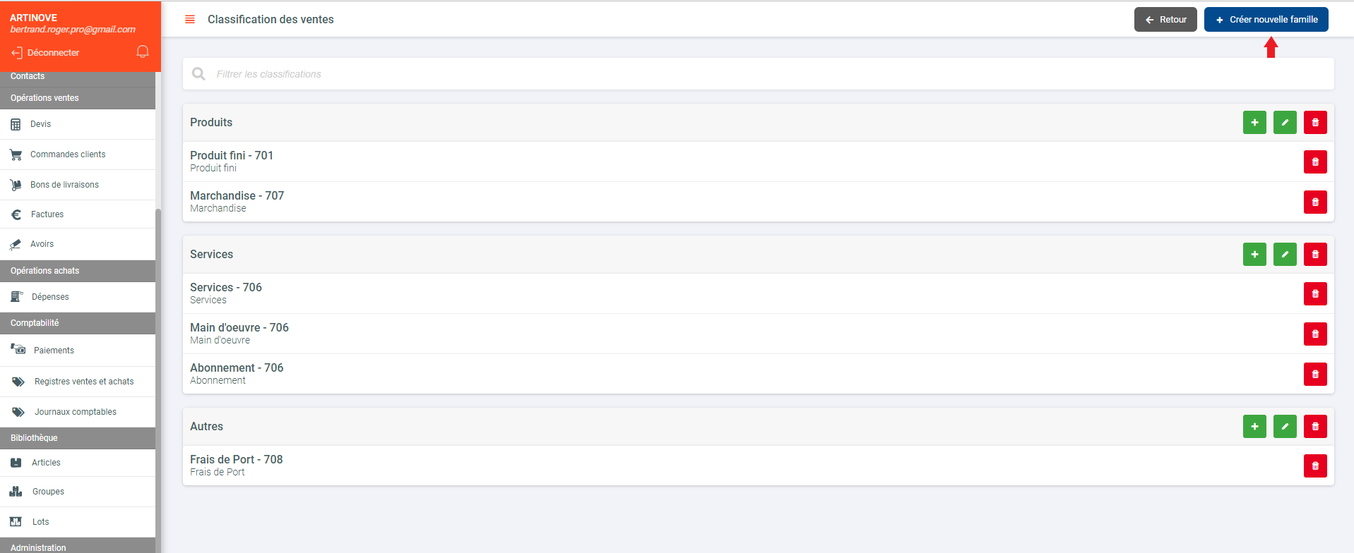 - Cliquer sur le plus pour ajouter une nouvelle famille ou ajoutez une catégorie dans les familles existantes " Produit, service, autre"