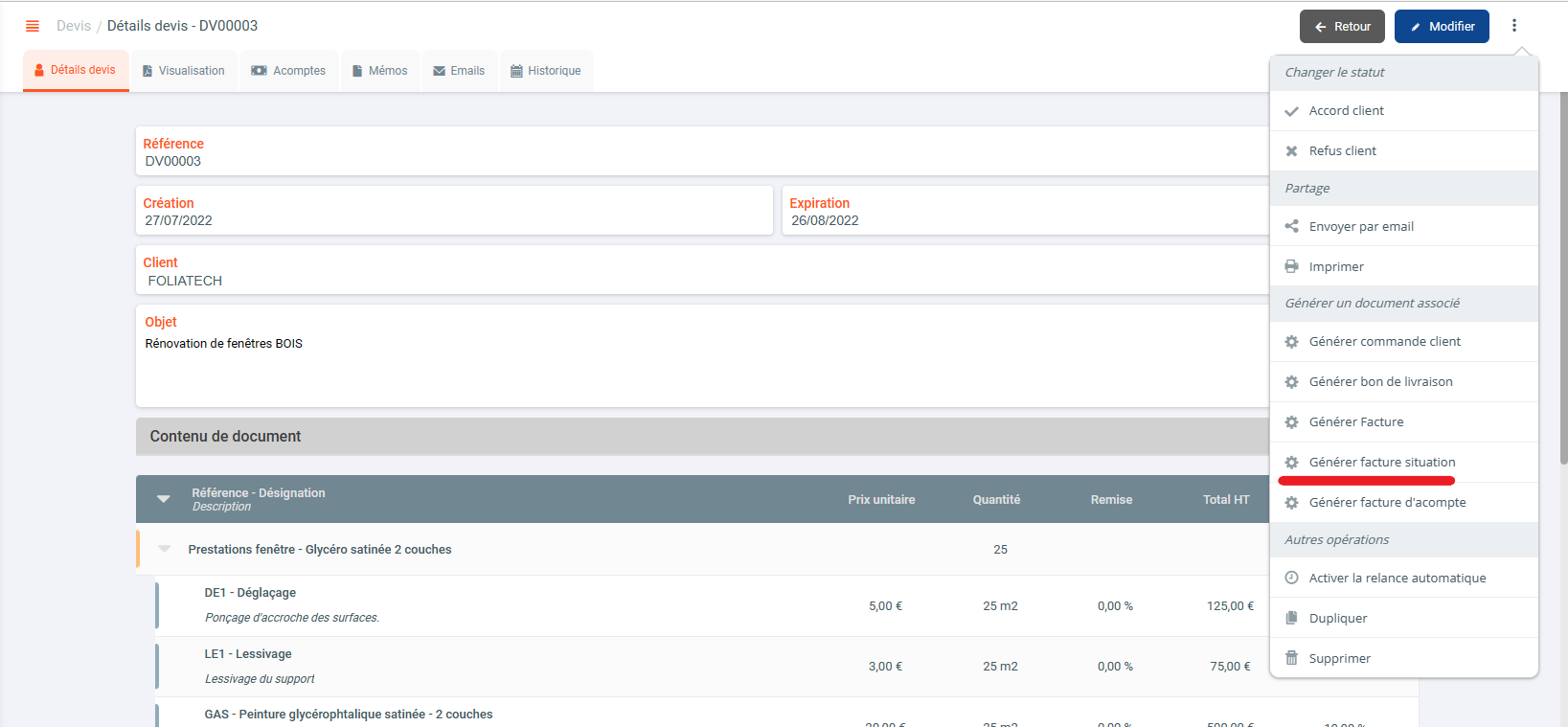 - Dans les options du devis, choisissez "Générer facture de situation"
