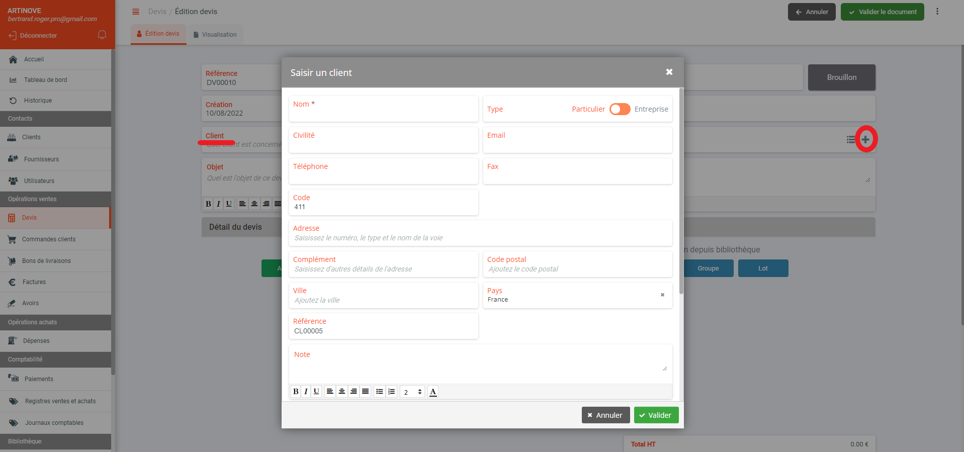 - Sur la fiche devis ou facture, cliquez sur "+" devant client.