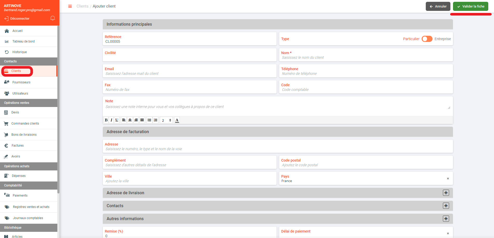 - Entrer les informations principales du nouveau client en complétant les champs de la fiche,