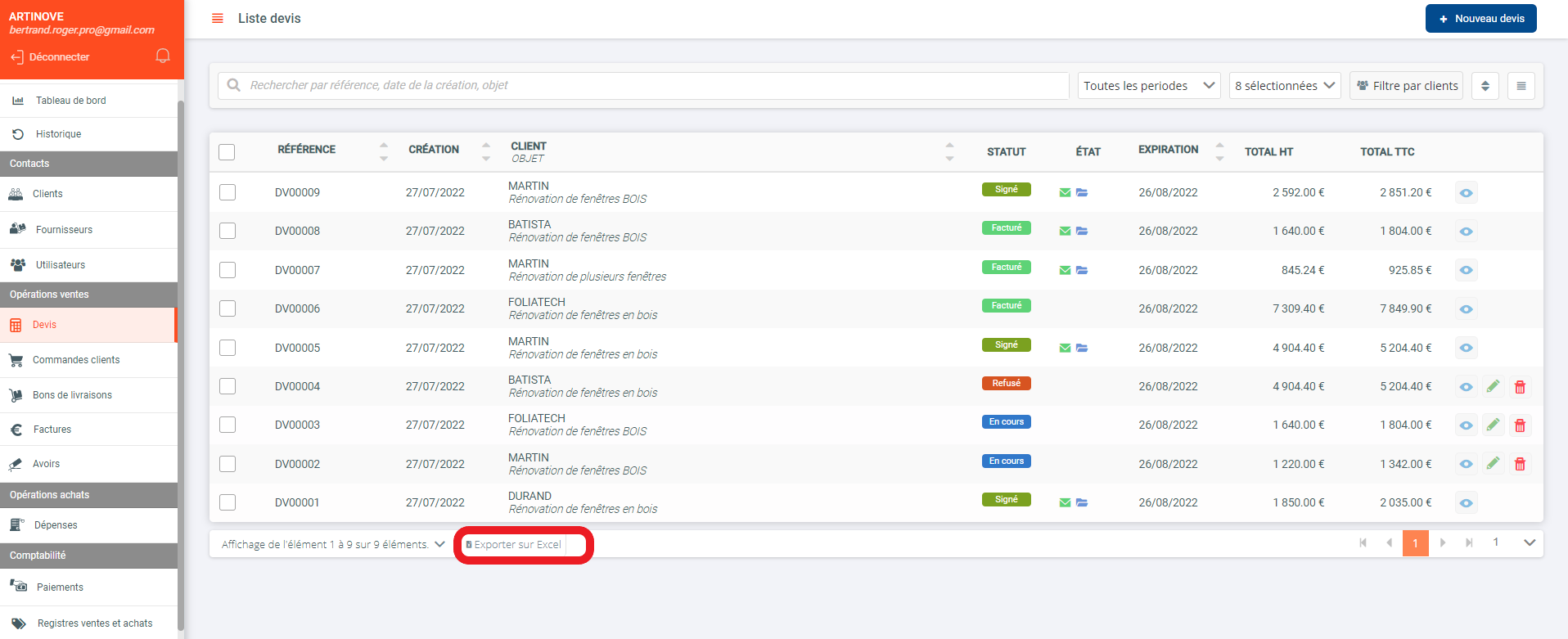 Exportez les données de votre entreprise sous forme de fichier Excel quand vous en avez besoin. L'option est disponible en bas de la liste de chaque module (clients, fournisseurs, devis, bons de commandes, bons de livraisons, factures, avoirs, dépenses, paiements et articles).