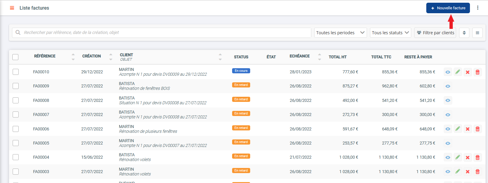 Remarque: Vous pouvez créer une facture à partir d'un devis, d'un bon de commande ou de livraison. L'option "Générer facture" est disponible dans le menu de chaque document.