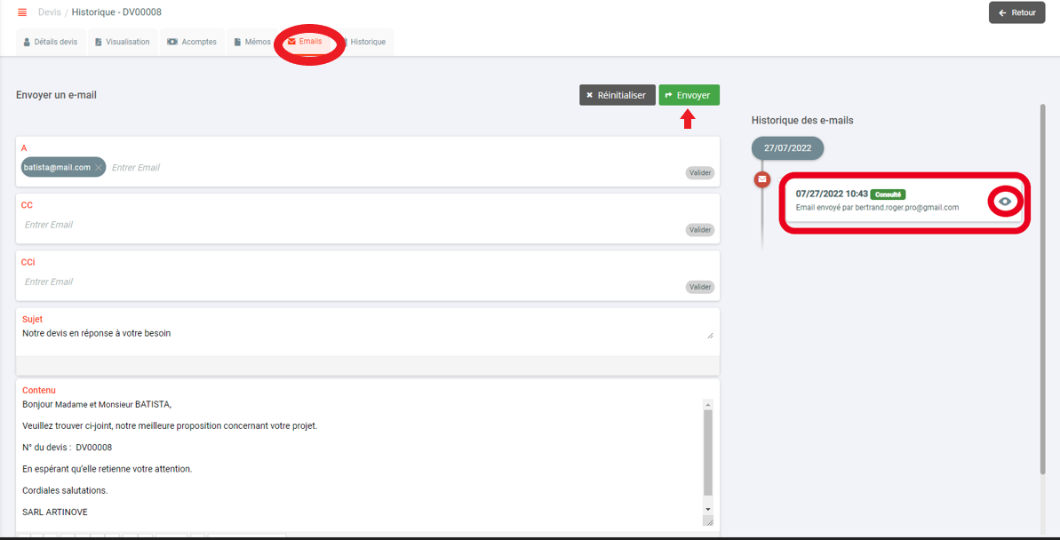 - Envoi et réception: Pour envoyer vos emails c'est très simple, depuis la rubrique Email saisissez l'adresse mail de votre client, cliquez sur envoyer, le client recevra ensuite un lien sur sa boite mail lui permettant de visualiser en temps réel ces documents,les télécharger, imprimer, signer ou refuser