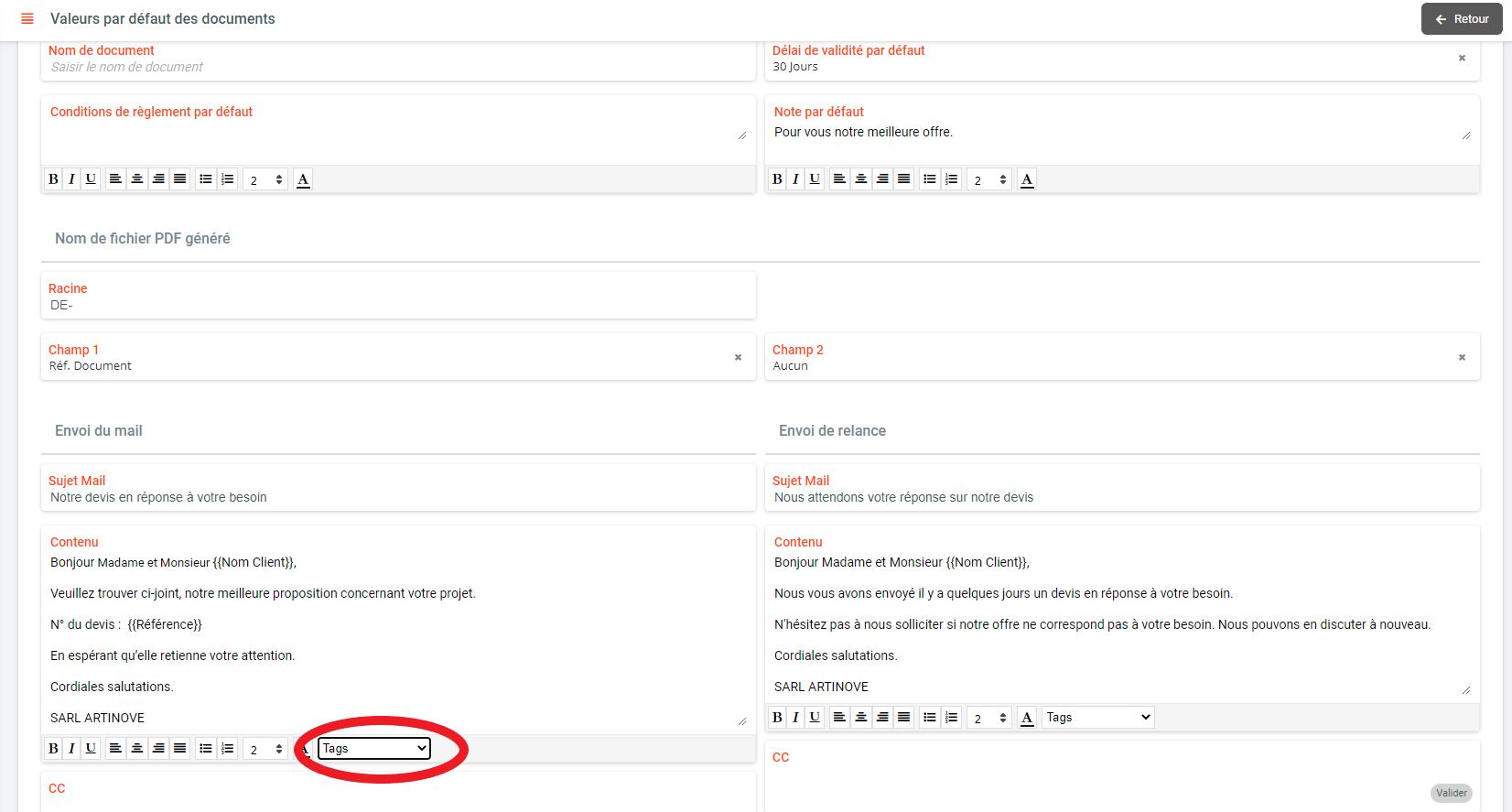 Pour ajouter ces tags il suffit d'aller dans Paramétrage => Paramétrage des documents => Valeur par défaut des documents => Contenu du mail => Tags