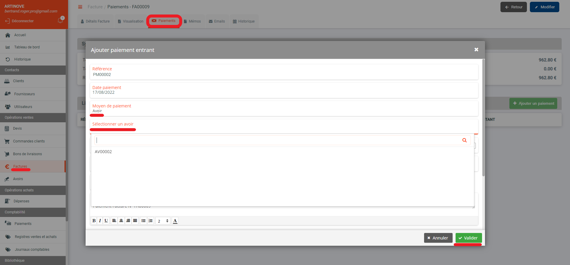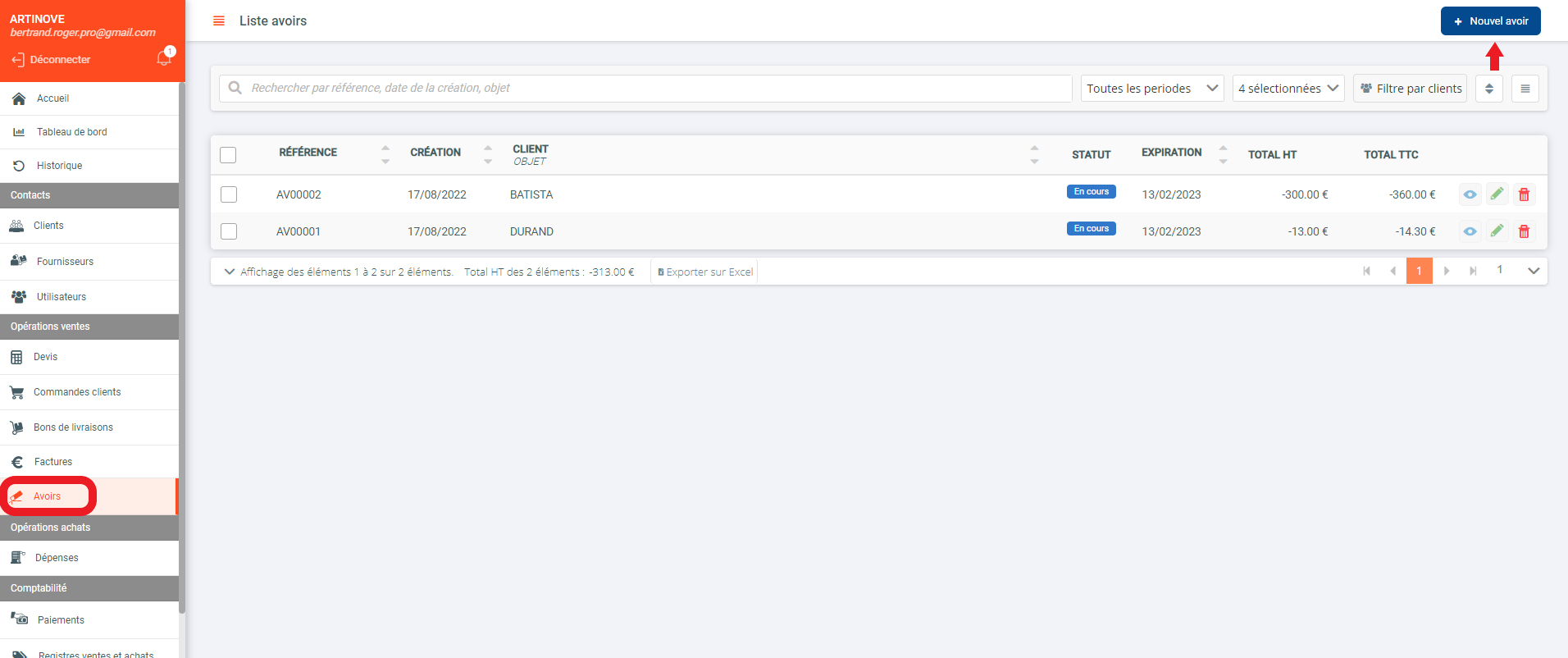 Créer une facture d'avoir sur le logiciel Artinove en 3 étapes: