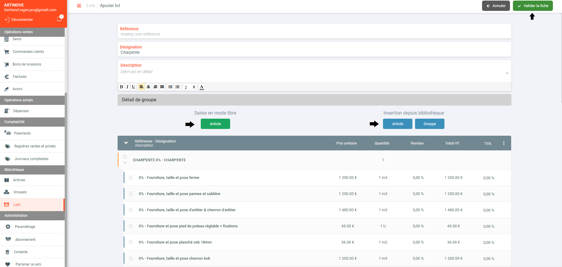 Remarque: Vous avez aussi la possibilité de créer un lot directement depuis un devis ou facture en mode saisie libre.