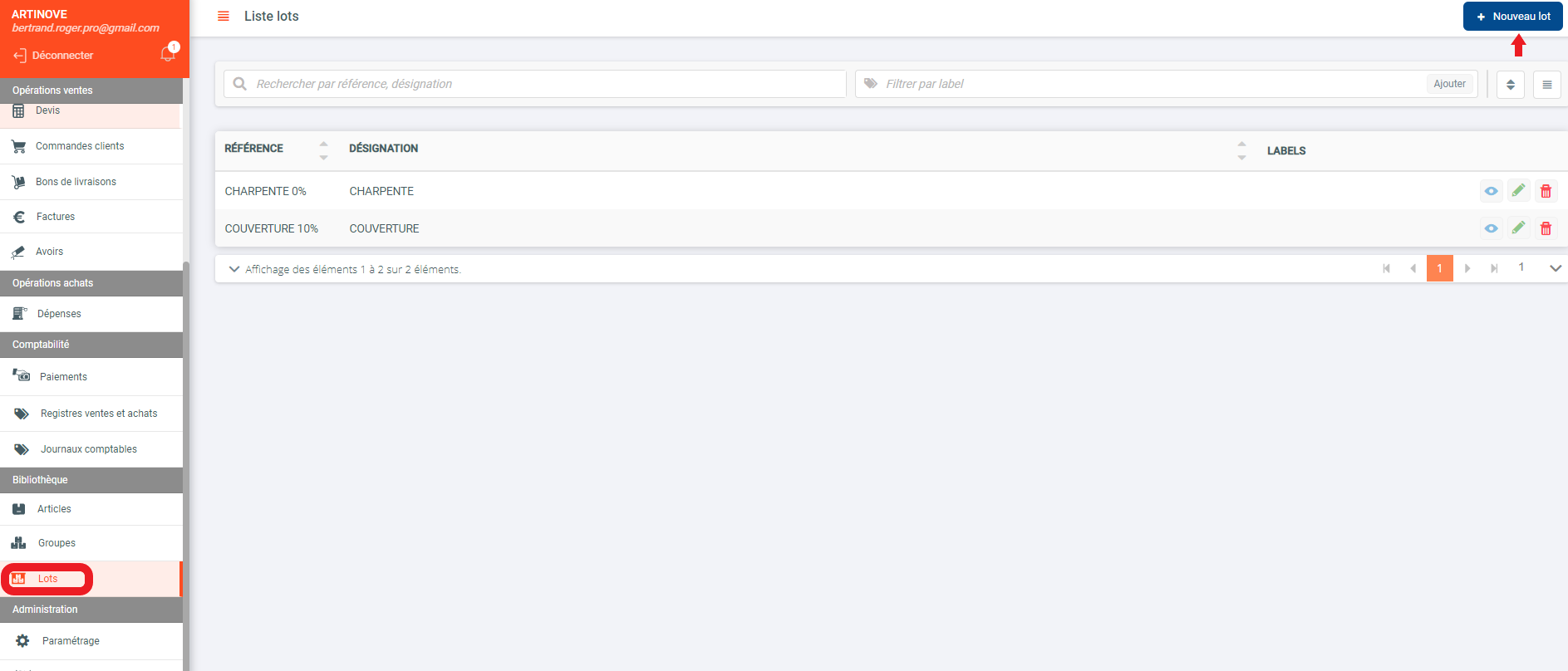 - Cliquer sur lots de la barre latérale puis sur +